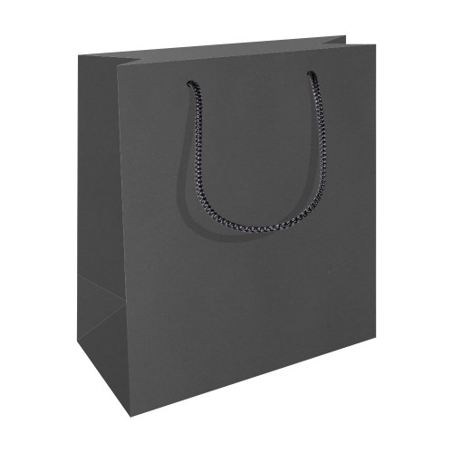 Fekete színű zsinórfüles ajándéktáska, A5 álló méretben.